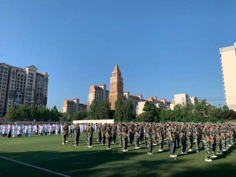 05 致辞发言,寄语未来 校长杨太红在致辞中强调,“强体魄,铸医梦,作风硬,医技精”不仅是学校38年来的办学理念,更是对每一位白求恩学子的深切期望。他勉励24级同学收心守纪、勇往直前,25级新生通过军训磨炼意志、夯实基础。 军事总指挥焦总教官代表全体教官发言,表示将以身作则,科学施训,帮助同学们增强国防观念、培养军人作风。 2025级口腔二班王陈辰同学代表全体参训学生庄严承诺:服从命令、刻苦训练、团结协作,誓以优异表现完成军训任务。 06 集体宣誓,铿锵誓言 在裴莹莹教官的带领下,全体参训学生举起右手庄严宣誓: “我服从命令,听从指挥,尊重教官,刻苦训练,遵守纪律,磨炼意志,不怕困难,坚决完成军训任务!” 誓言铮铮,掷地有声,展现了同学们迎接挑战的决心与信心。